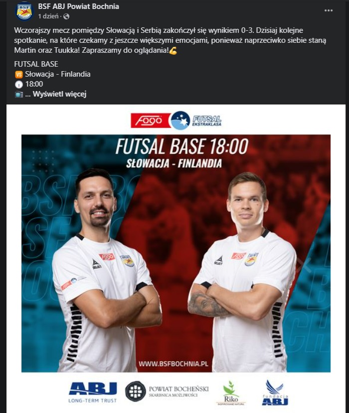 Rzecznik prasowy drużyny BSF ABJ Powiat Bochnia występującej w najwyższej klasie rozgrywkowej, tj. FOGO Futsal Ekstraklasa. Obsługa mediów społecznościowych, strony klubowej oraz tworzenie treści, kontakt z mediami, przeprowadzanie i przygotowywanie wywiadów oraz inne bieżące zadania.